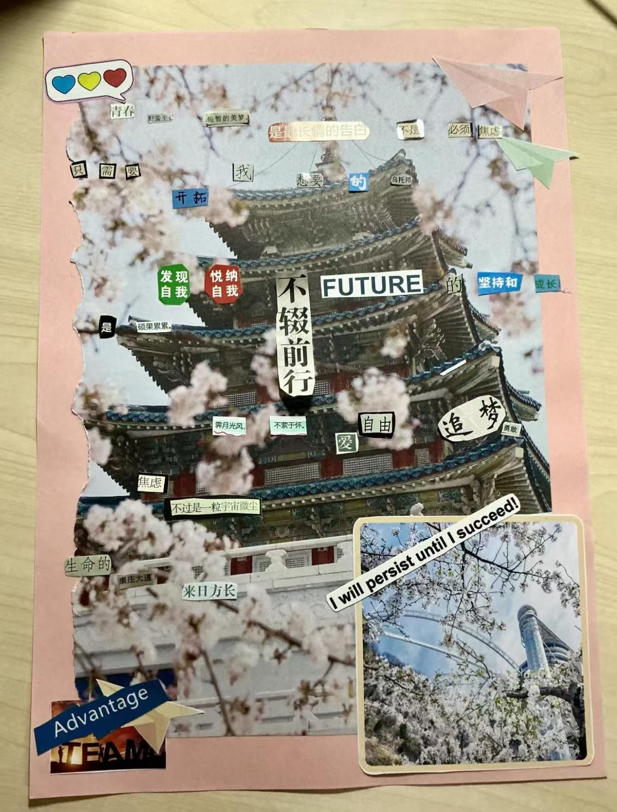 文字内容上,“发现自我”“悦纳自我”是青春成长关键,青春是探索自我的旅程,只有认清并接纳自己,才能不惧外界眼光,“不辍前行”;“追梦”“自由”“爱”点明青春追求,是心灵向往,给予我前行的力量;“是最长情的告白”“来日方长”,体现着我对生活与未来温柔期许,即使焦虑如影随形,也坚信“不过是一粒宇宙微尘”,渺小却独特;“I will persist until I succeed!”直白喊出我内心的坚持决心,激励我在青春路上披荆斩棘;“青春”“成长”“坚持”等词,是生活的切片,拼凑出积极向上的青春模样,提醒着我拥抱生活,在青春中绽放正能量。
