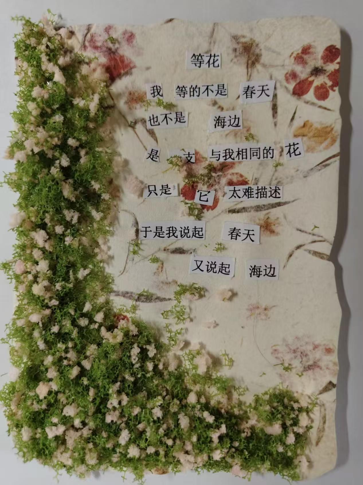 本幅作品剪贴诗作品名是《诗》,处于春天的尾巴,希望可以重新唤起大家对春的感觉,整体文字底色都是绿色黄色很明媚和春天温柔的颜色,充斥了花朵的剪贴画,还点缀了新鲜的黄色花朵点。文字基本是从明信片和外卖袋子以及各种废弃物品上剪下来,也是这些物品的再利用。整体上是歌颂春天给大地增添了新的色彩,济南的春天又很短暂,希望帮助大家更多的记住春天,整体时将春天最后联想到财大也是希望建立起学校与春天温柔感觉的链接。