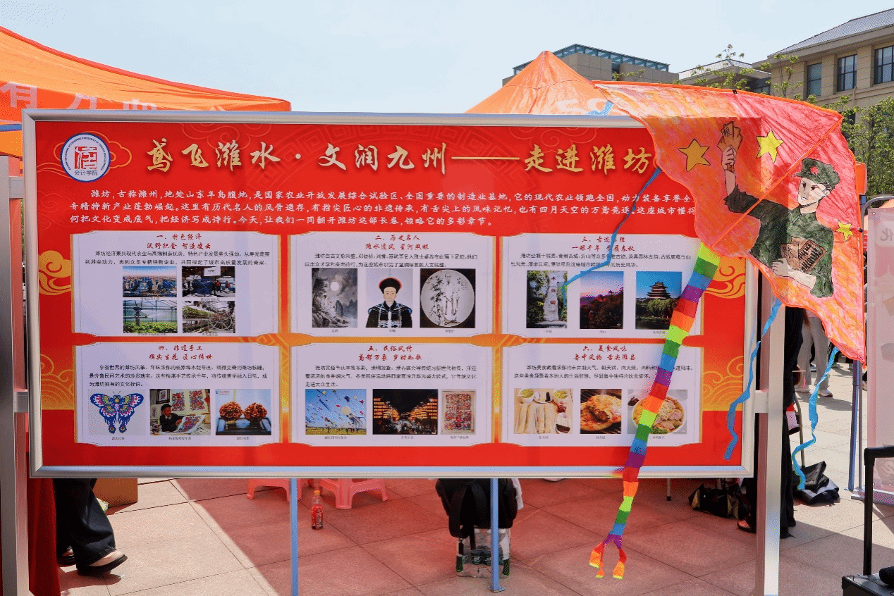 主题展示区以特色展板为载体,集中呈现潍坊特色经济、历史名人、古迹名胜、非遗手工、民俗风情、美食风味六大板块内容,全方位展现潍坊经济发展成就与鸢都深厚文化底蕴。从风筝千年传承、杨家埠木版年画、潍坊核雕等非遗瑰宝,到郑板桥、刘墉等历史名人轶事,再到朝天锅、肉火烧等本土饮食民俗,展板以图文并茂的形式,带领青年学子走近传统民俗、领略齐鲁匠心,在沉浸式品读中探寻传统文化魅力,厚植文化自信,于文脉浸润中感悟非遗传承与文化创新的时代价值。