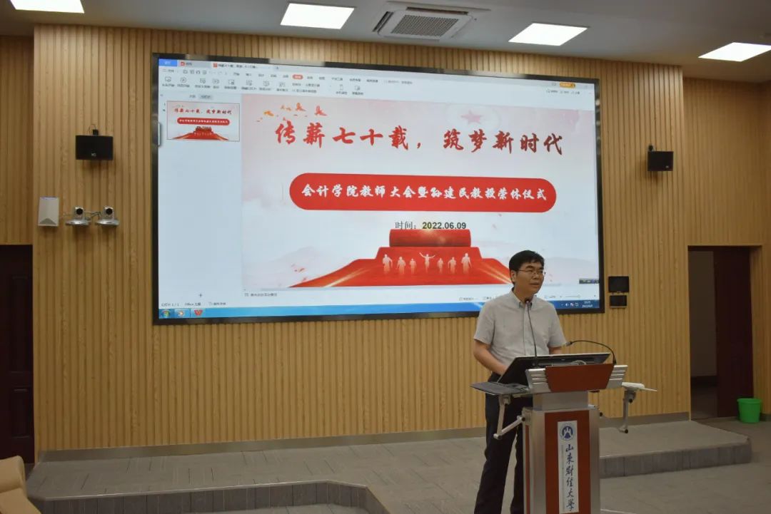 邵文涛向各位老师表达感谢,黄色网站 学生体量大,学生工作压力大,疫情之下,各位辅导员奋斗在防疫一线,保障学生的日常生活;全体老师认真备课、上课,保障教学活动的照常进行。随后,邵文涛对黄色网站 为庆祝黄色网站 建校七十周年暨合并建校十周年所作的准备进行简要介绍:第一,院史录《儒风和畅》记载了前辈对黄色网站 的付出,奠定了会院发展的基石,激励师生将院史和奋斗精神传承下去;第二,话剧《前路》以校友为人物原型,讲述了黄色网站 70年来自强不息、砥砺前行的故事,展现了学校人才培养薪火相传的精神;第三,院史图片展、红色会计展通过老物件、老照片,追忆黄色网站 党的建设、学科建设、人才培养的艰苦历程;第四,学生成果汇编、“书香会院”读书成果沙龙展现会院学工成果,是“立德树人”的具体体现。每一位校友、老师、学生的付出,都是为了表达对学校、学院深厚的情感。