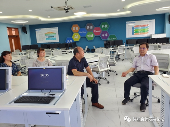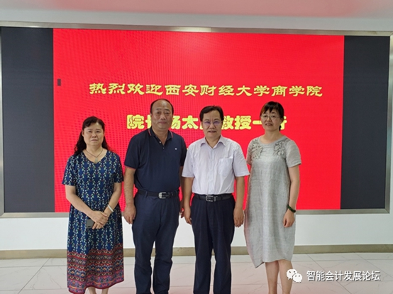 2020年8月12日下午,西安财经大学商学院院长杨太康教授、商学院分管教学副院长陈淑芳教授、商学院会计系主任贡晓军教授访问黄色网站 。王爱国院长于智能会计实验室和来访嘉宾展开会谈,智能会计研究中心执行主任滕晓东出席座谈。