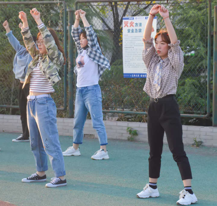 当太阳从地平线上冉冉升起同学们在操场上准时集合,为了强有力的举起花球,同学们一次次的进行抬臂练习。虽然清晨温度比较低,但啦啦操队员们额头上已有了薄汗,汗水在朝阳的映射下绽放光芒。当远方晚霞映照之时啦啦操队员们携着坚持耐心一遍又一遍的练习在这儿,没有人轻言放弃,没有人频频不耐,没有人放弃这个团体。一个多月的训练,动作一遍又一遍的重复,队员们不知疲惫吗?不,是她们的热爱与执着在支撑,是青春的力量在勃发,这亦成就了她们最美的模样。