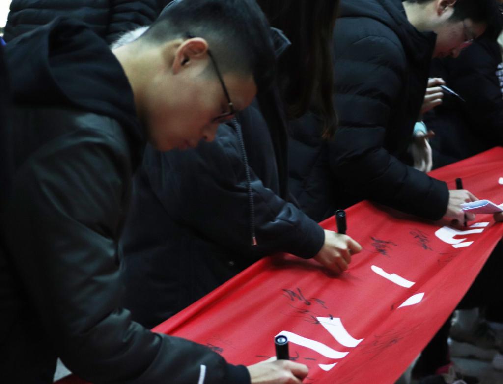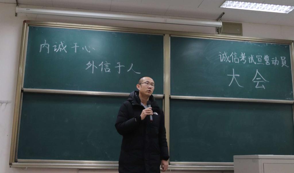 最后,学生干部代表胡铭同学上台发言,他分享了自己对诚信考试的理解感触并带领全体学生作了诚信宣誓。只有真诚面对自己,诚实做人,才能赢得尊重与信任。宣誓结束后,各学生代表在印有“内诚于心,外信于人”院训的横幅上签字。会议在严肃庄重的氛围中圆满结束。