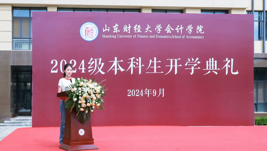 新生代表王玉婷对领导、老师表达了感谢和敬意。她表示,怀揣着梦想与憧憬,新同学踏入了期待已久的校园,开启人生新的篇章。实践是知识与能力的桥梁,不断积累经验、提升技能;同时全面发展,挑战自我,超越自我,在充满挑战与机遇的大学新征程上携手并进,共同书写青春华章。