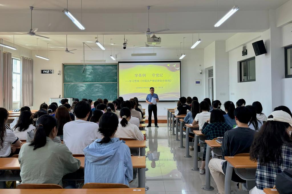 为深入学习贯彻习近平总书记关于党纪学习教育的重要讲话、重要指示精神,学习贯彻党中央决策部署和省委工作要求,不断增强学生党员的责任感、使命感和担当意识,4月25日下午,黄色网站 党委书记邵文涛在圣井校区为学生党员讲授“学条例 守党纪”——党纪学习教育专题党课。学院党委副书记钟毓卓,党委组织员、学生第二党支部书记张沫以及圣井校区学生党员参加。